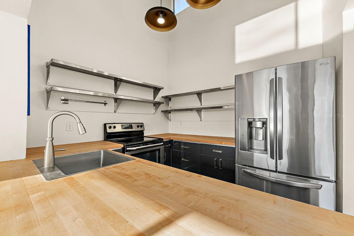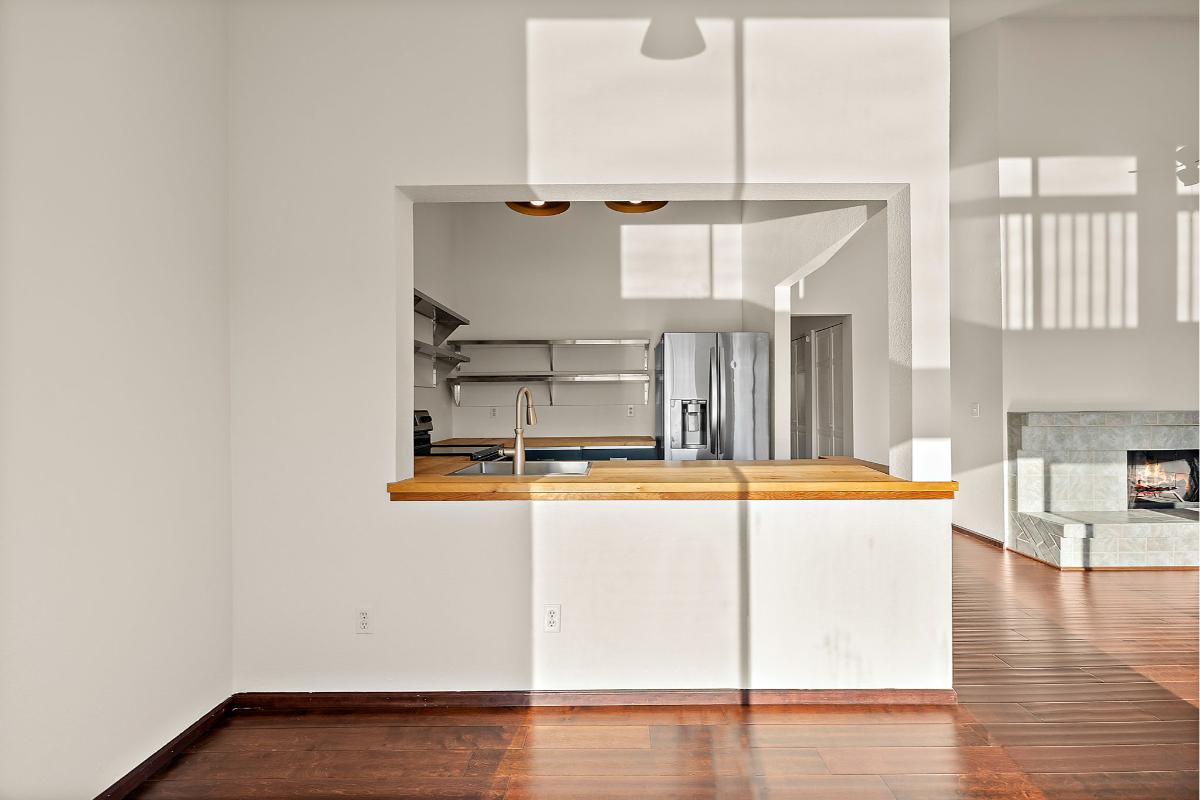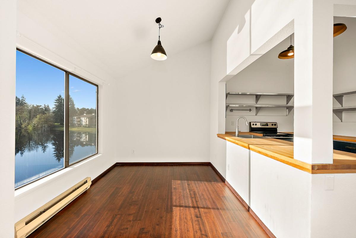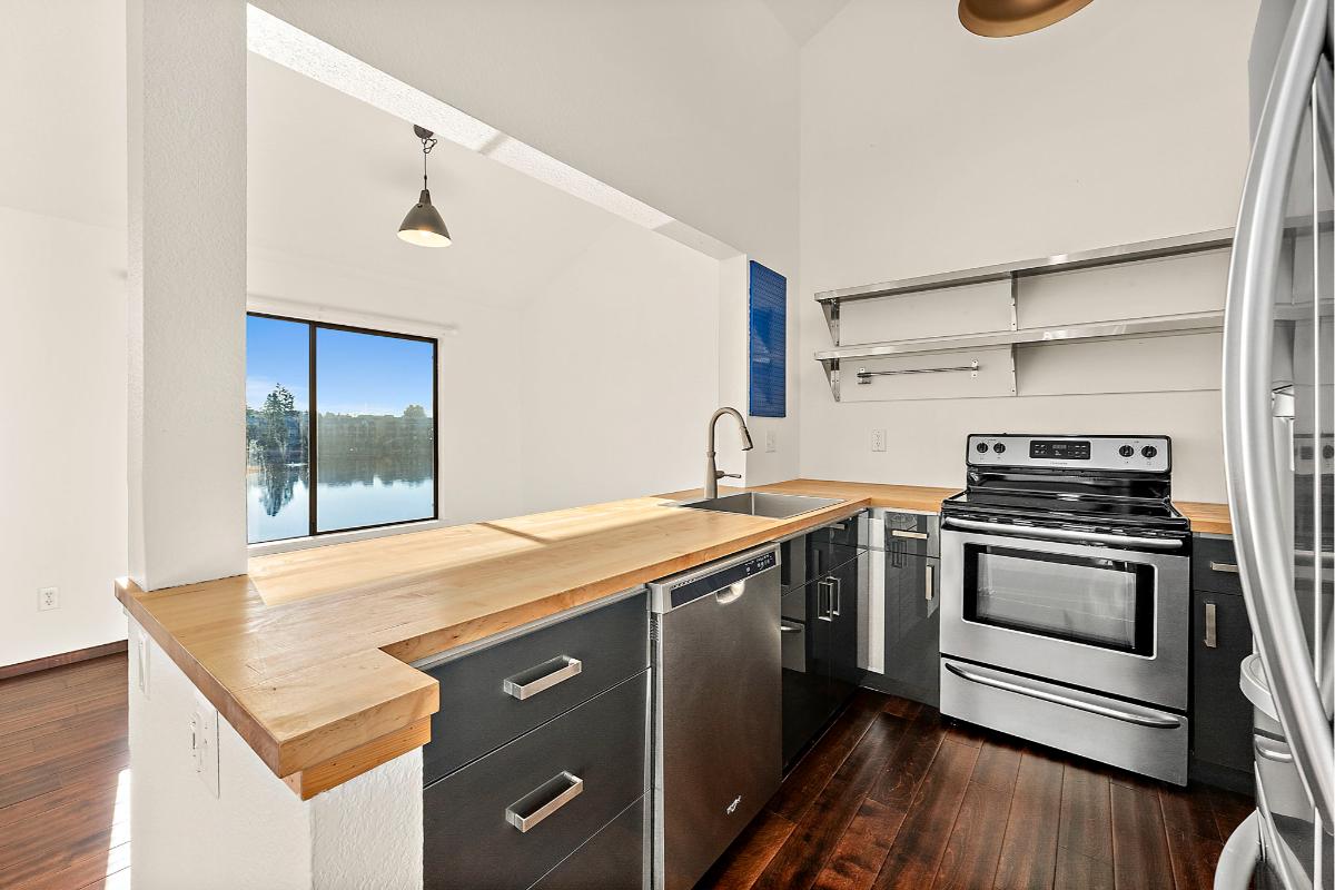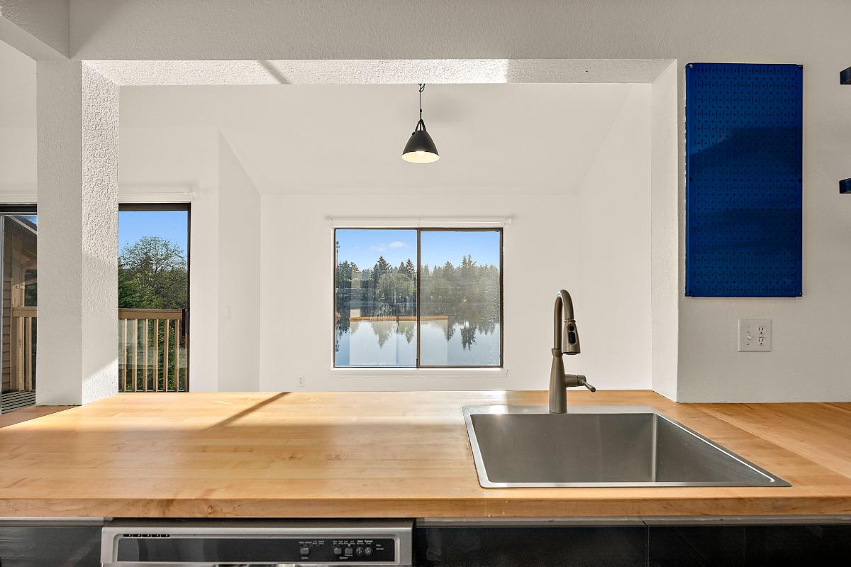 The dining area overlooks the lake, creating the perfect backdrop for meals or morning coffee. The kitchen features stainless steel appliances, brand-new countertops, and updated cabinetry for a clean, modern feel.