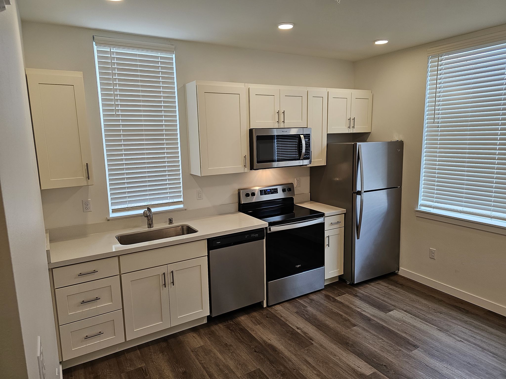 Cook up culinary wonders in your kitchen with sleek quartz countertops and stainless steel appliances.