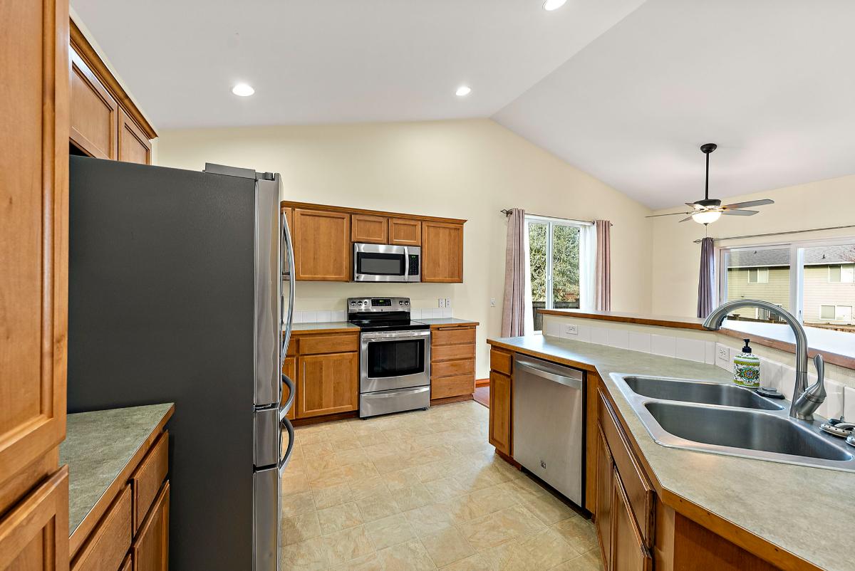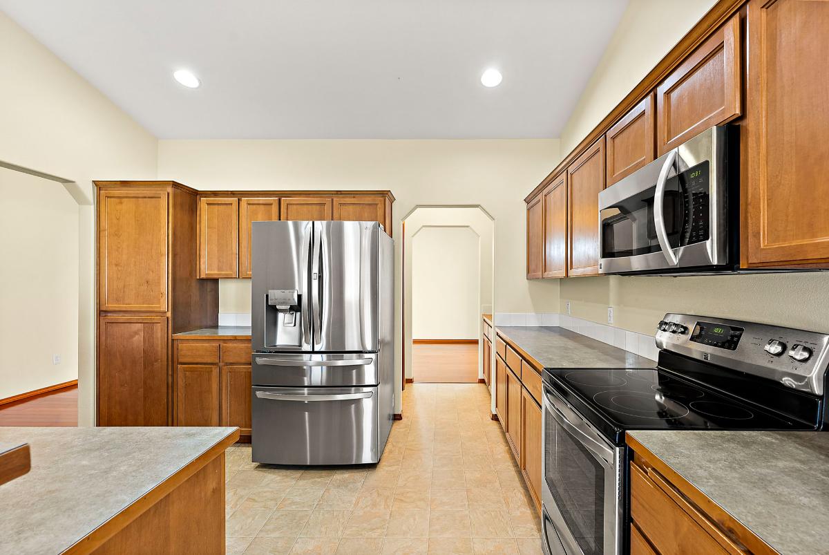 The kitchen is both practical and inviting, featuring stainless steel appliances, a dishwasher, microwave, and a spacious walk-in pantry that’s perfect for storage and organization. A formal dining room provides a dedicated space for meals, entertaining, or even a home office setup.