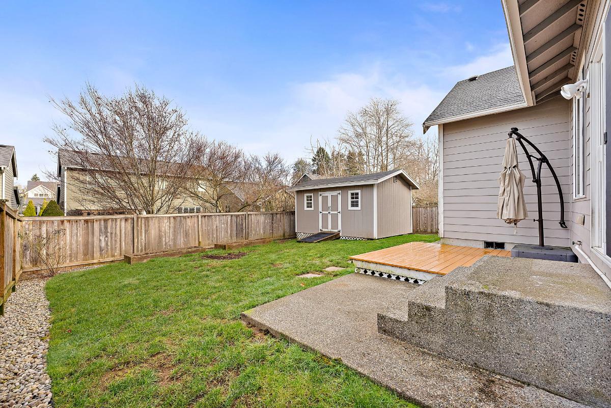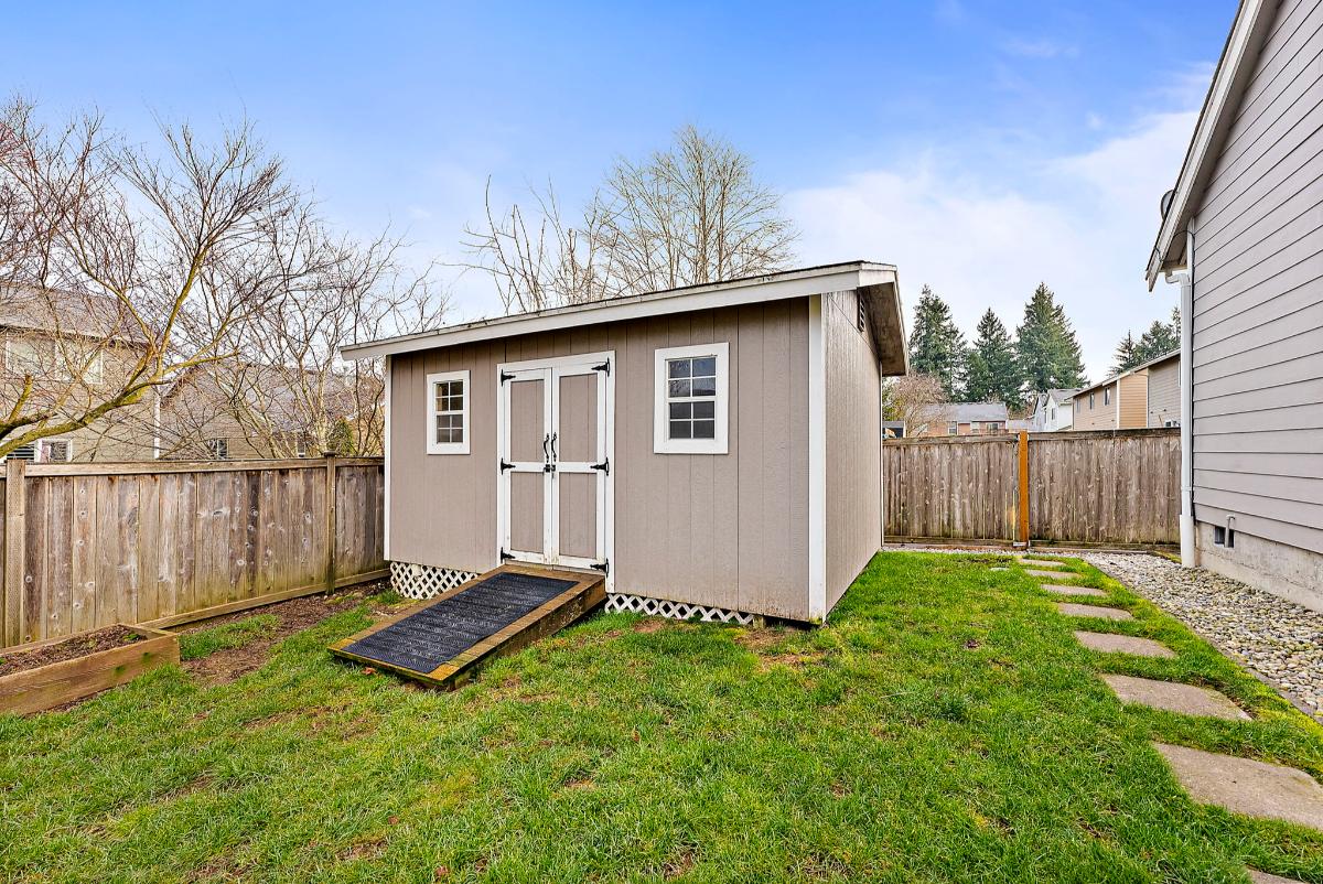 Step outside to enjoy a fully fenced backyard with established garden beds and an additional storage shed — ideal for tools, seasonal items, or gardening supplies. The attached two-car garage includes a rare and convenient standing dog wash, making cleanup easy year-round. A full-sized washer and dryer are included for added convenience.