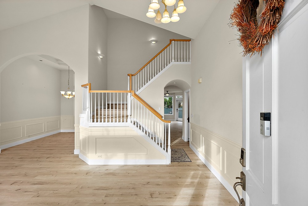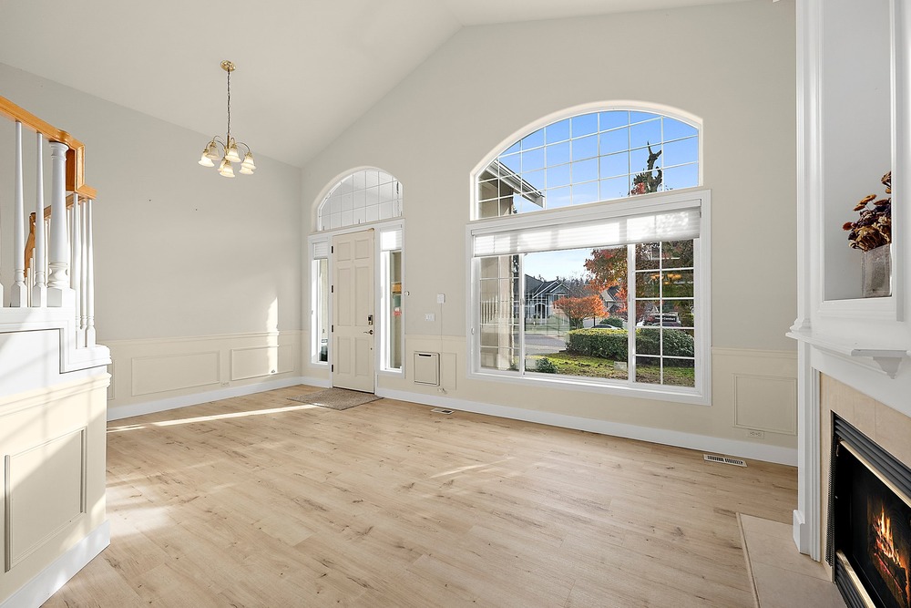 Step inside to find dramatic living spaces with soaring ceilings, gleaming hardwood floors, and two gas fireplaces, creating a warm and inviting atmosphere. The updated kitchen is a chef’s dream, complete with quartz countertops, stainless steel appliances, a gas stove, and an eating area that opens seamlessly to the cozy family room. The main level also features one bedroom, perfect for guests, an office, or additional flexibility.