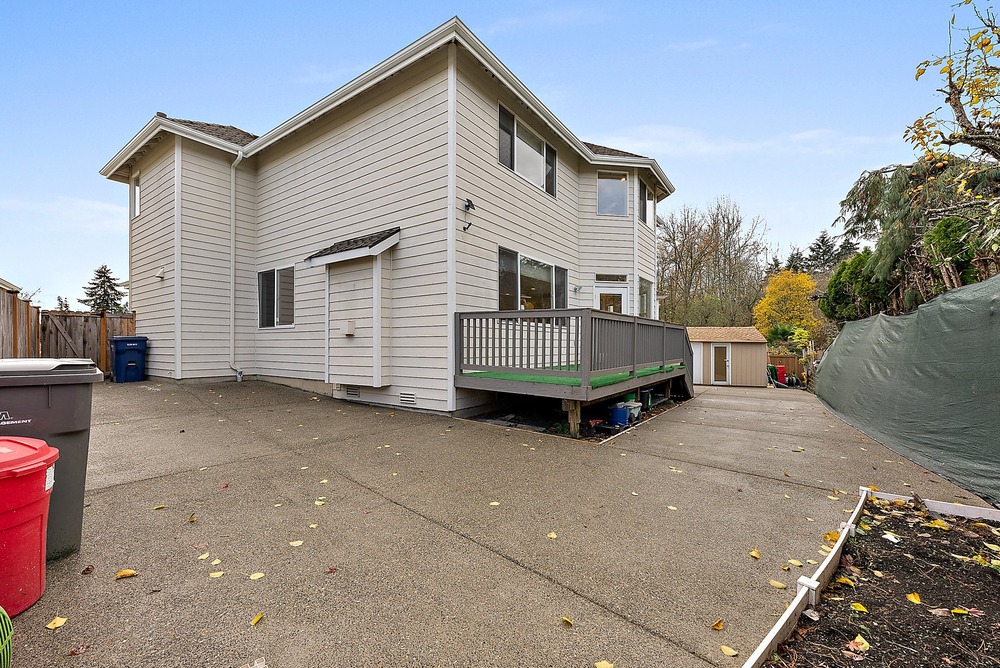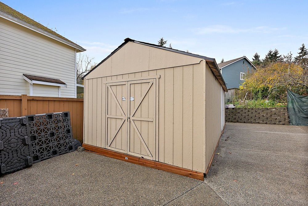 The fully fenced backyard is designed for easy living and entertaining, with privacy fencing, a freshly painted deck, and a low-maintenance landscape. An extra workshop in the back provides additional storage or creative space for hobbies and projects.